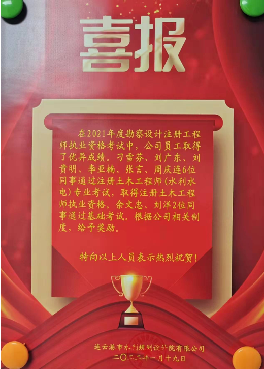 在2021年度勘察设计注册工程师执业资格考试中,公司员工取得了优异成绩。刁雪芬、刘广东、刘贵明、李亚楠、张言、周庆连6位同事通过注册土木工程师(水利水电)专业考试,取得注册土木工程师执业资格。余文忠、刘洋2位同事通过基础考试。根据公司相关制度,给予奖励。