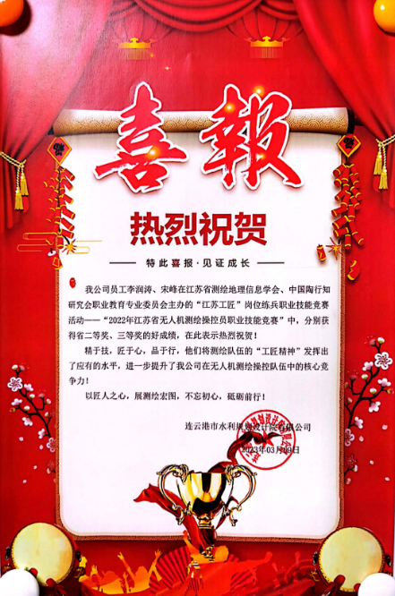 我公司员工李润涛、宋峰在江苏省测绘地理信息学会、中国陶行知研究会职业教育专业委员会主办的“江苏工匠”岗位练兵职业技能竞赛活动——“2022年江苏省无人机测绘操控员职业技能竞赛”中,分别获得省二等奖、三等奖的好成绩,在此表示热烈祝贺!